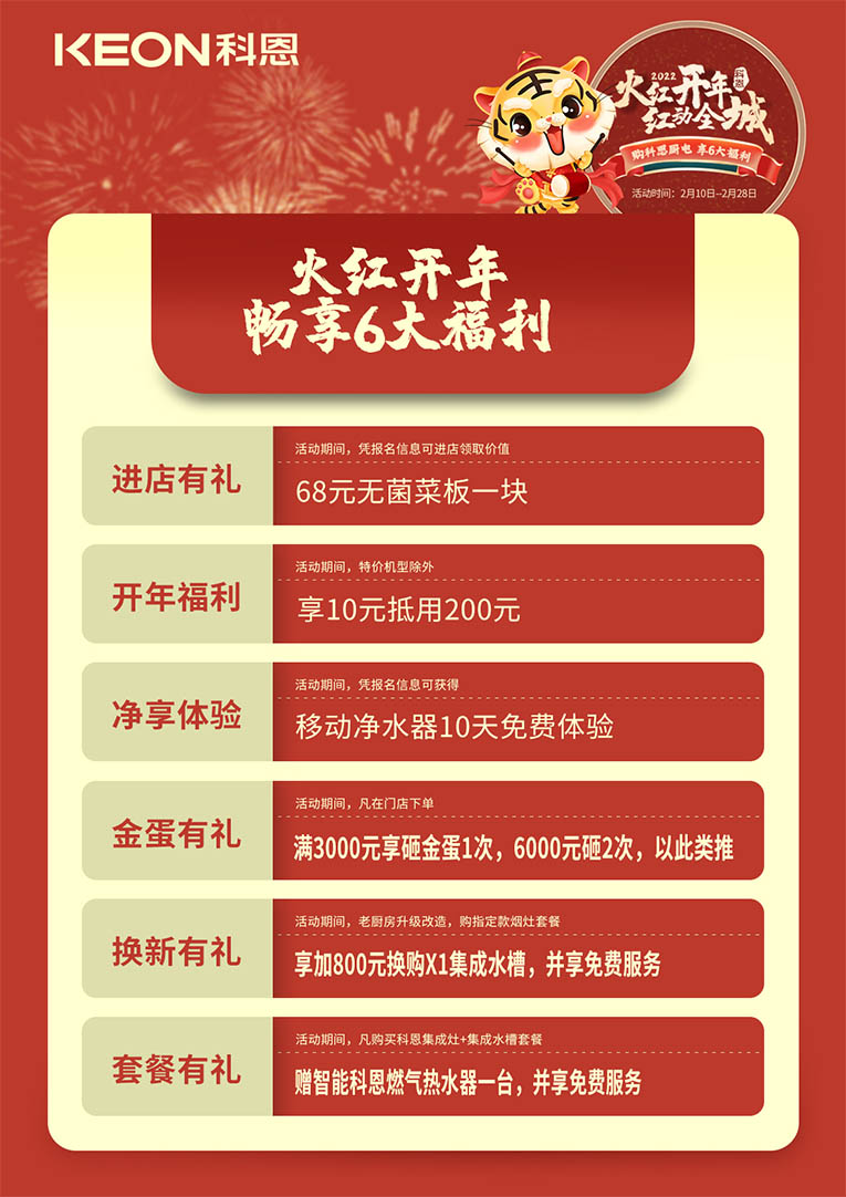 新年新氣象,新舊物品的更迭,不僅是告別過去的一年,更是蘊(yùn)藏對新一年的憧憬~新的一年,集成灶十大品牌、廚電行業(yè)十大品牌科恩集成灶“火紅開年,紅動全城”活動,加持您的新氣象,“灶”就虎虎生威的2022!