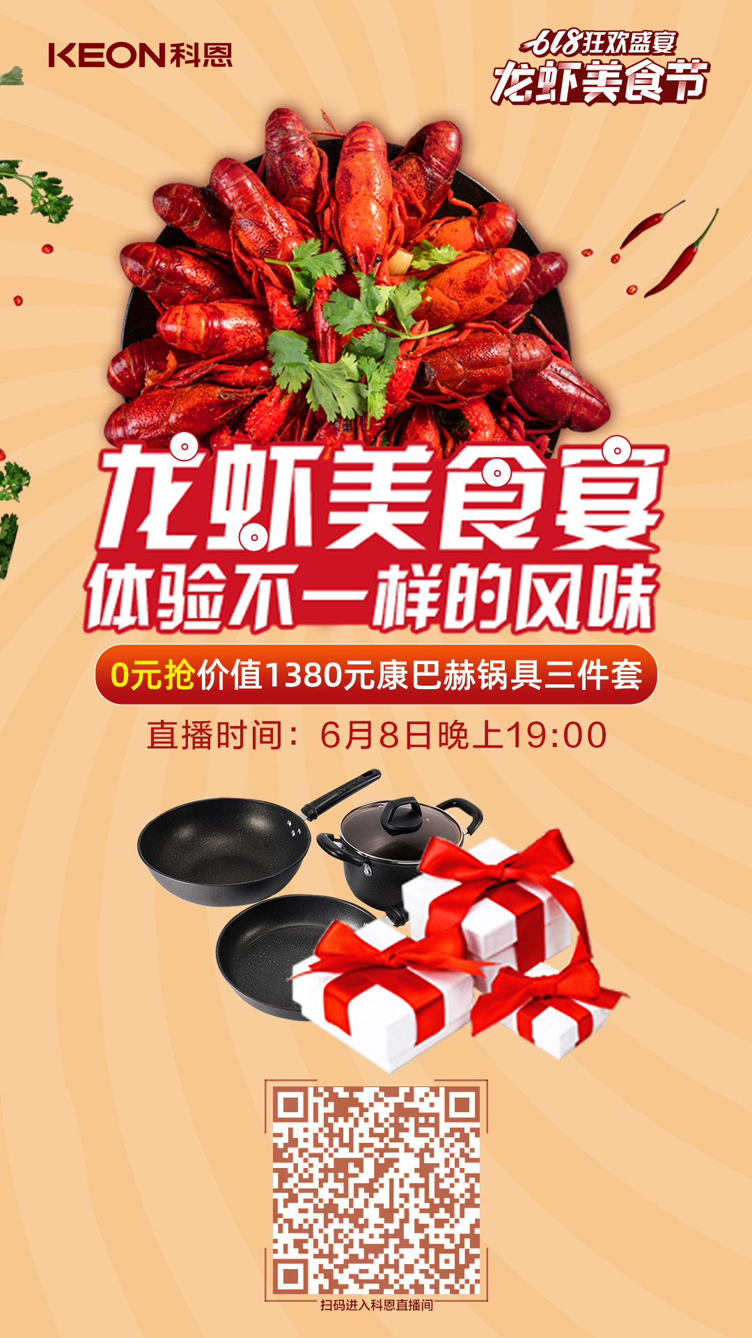 TA來了!TA來了!TA來了!618狂歡盛宴科恩龍蝦美食節(jié)——龍蝦美食宴線上直播終于來了,TA帶著傳統(tǒng)和創(chuàng)新的美味來了,TA帶著誠(chéng)意滿滿的福利來了,6月8日19點(diǎn),來科恩直播間,我家的科粉,我來寵?。?!