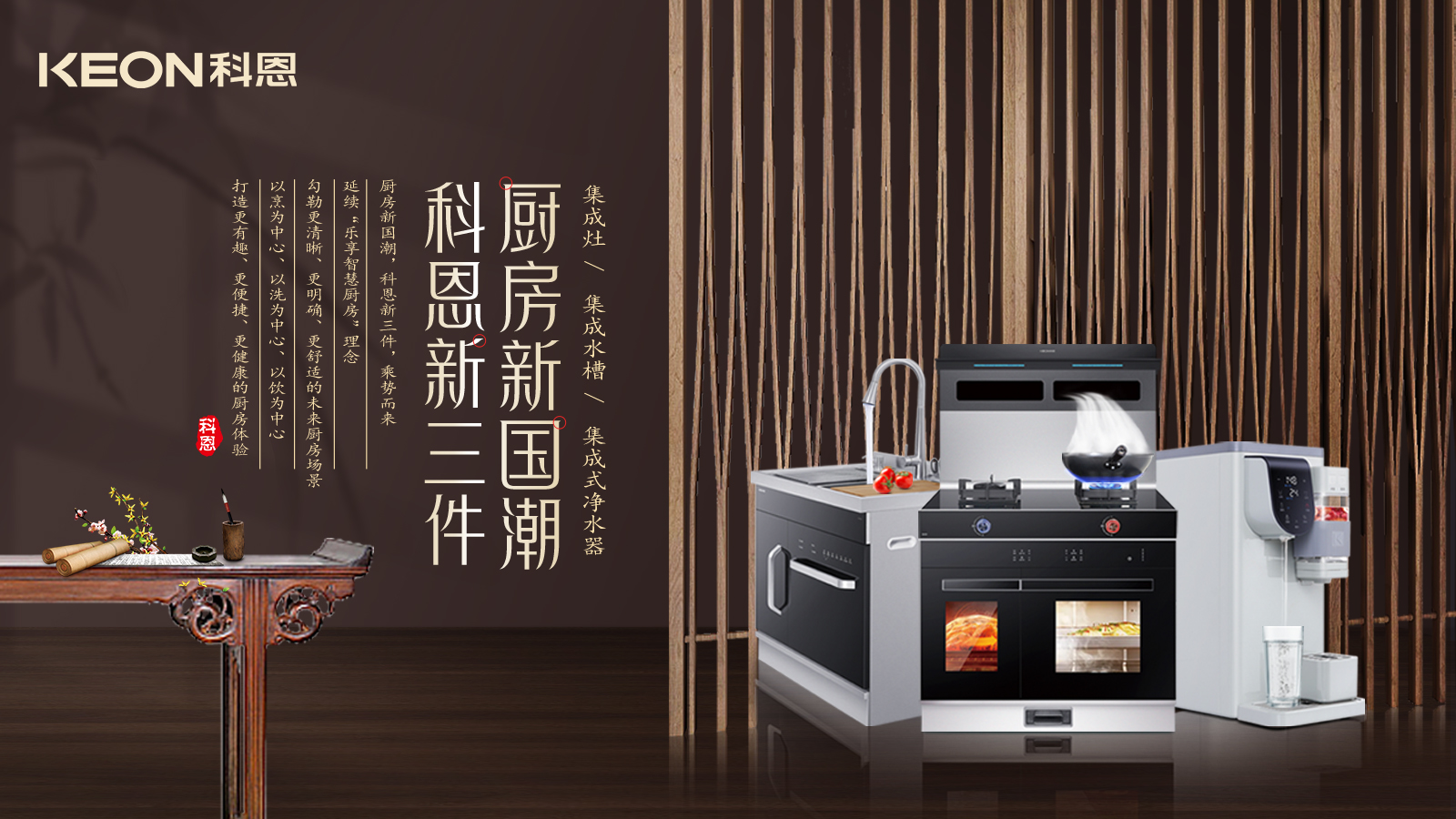 廚房新國(guó)潮,科恩新三件,樂(lè)享智慧廚房,科恩電器形成以“集成灶、集成水槽、多功能移動(dòng)凈水器”的科恩新三件,打造廚房新國(guó)潮,于方寸間體會(huì)更多愜意,于細(xì)微處,感受更多用心!