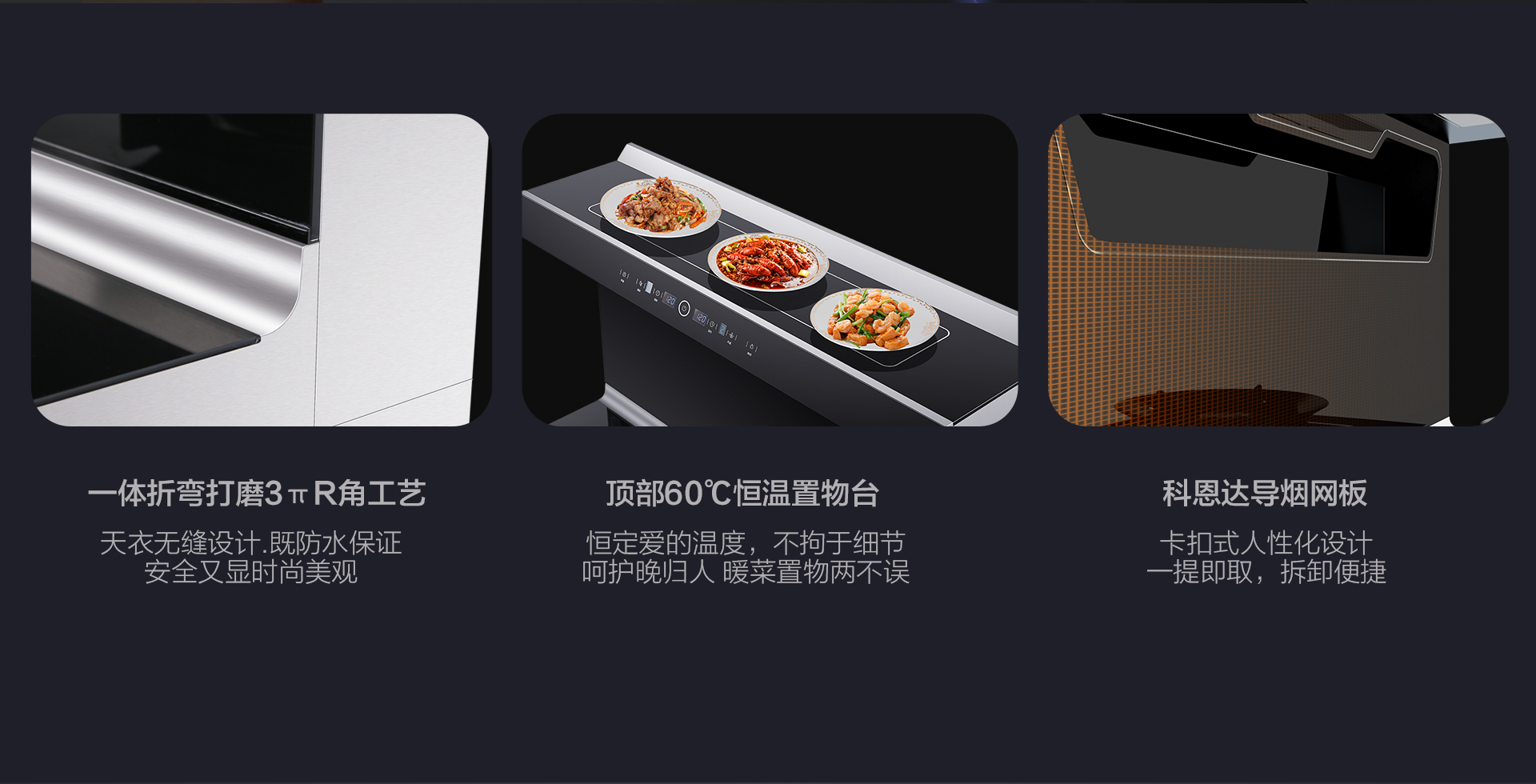 ◆黑晶防爆玻璃臺面,具備具備高性能防爆特性;機頭與機身結(jié)合處采用一體折彎打磨3πR角工藝——天衣無縫設(shè)計,既能防水保證安全、打理便捷又顯得時尚美觀;再加上一提即取的科恩達導(dǎo)煙網(wǎng)板,分分鐘實現(xiàn)輕松拆卸,使得內(nèi)部清潔打理成為舉手之勞!