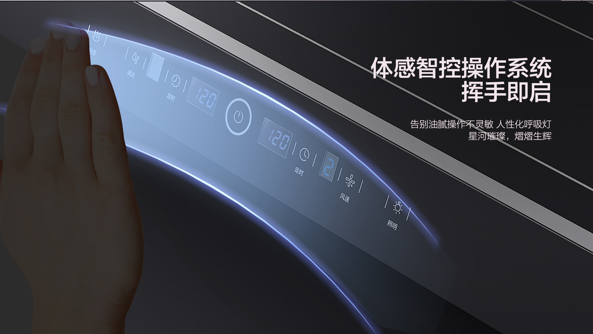 ◆體感智控操作系統(tǒng),揮手即啟,老人也可輕松使用,從此告別油膩雙手導(dǎo)致的煙機(jī)按鍵不靈敏,專心烹飪,再無手忙腳亂的煩惱!