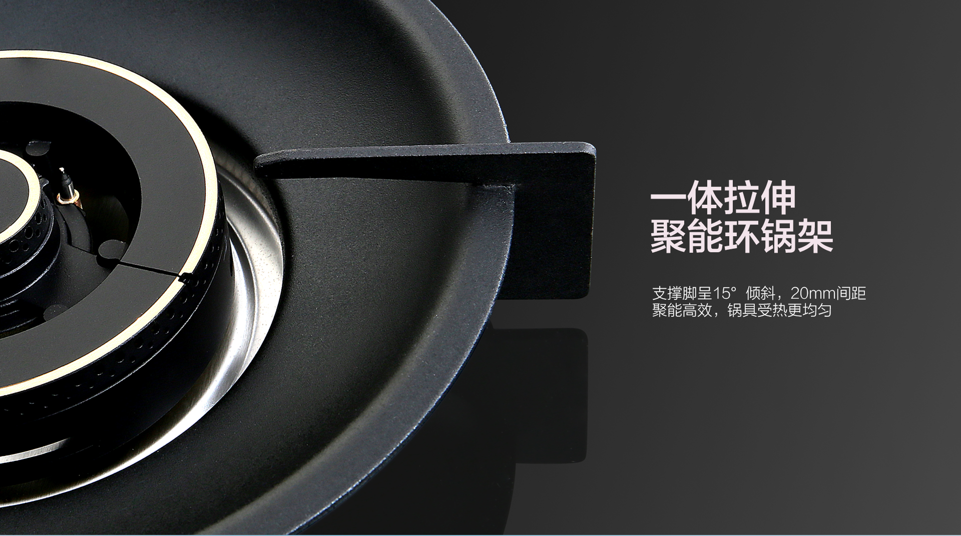 ◆一體拉伸聚能環(huán)鍋架,支撐腳呈15°傾斜,20mm間距,聚能高效,鍋具受熱更均勻!