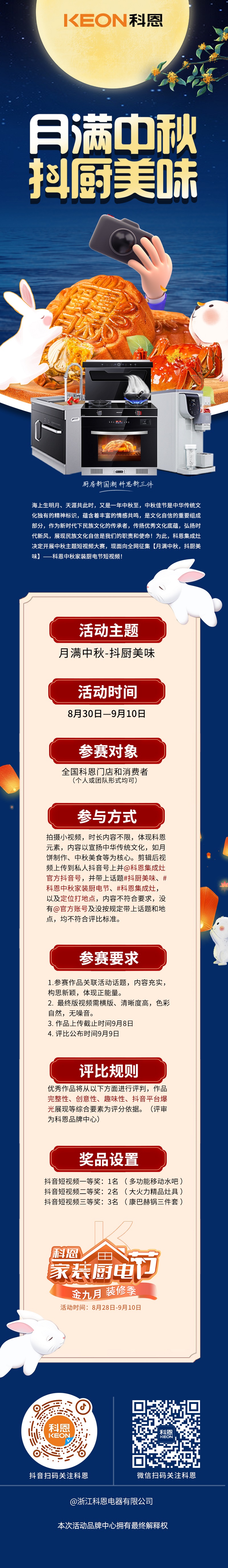 心動不如行動!除了1元享特權(quán)和直播大抽獎活動,小科還為大家準(zhǔn)備了【月滿中秋,抖廚美味】科恩家裝廚電節(jié)中秋短視頻征集活動,炫酷、創(chuàng)意、戲精、腦洞、鬼馬,你想不想拍一段能“火”的視頻?拿起手機,“抖”出精彩,你敢拍我就敢送!