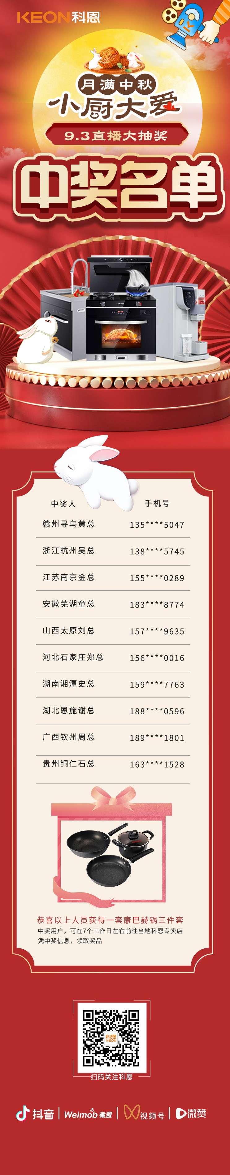 話不多說,先來公布9月3日晚第二期月餅DIY直播現(xiàn)場中獎名單,恭喜以下10位幸運寶寶!請在七個工作日左右,憑中獎信息到當(dāng)?shù)乜贫鲗Yu店領(lǐng)取您的專屬獎品!沒有中獎的寶寶也不用氣餒,沒準(zhǔn)下一期的直播大獎就在向你招手!你就是幸運錦鯉本鯉!