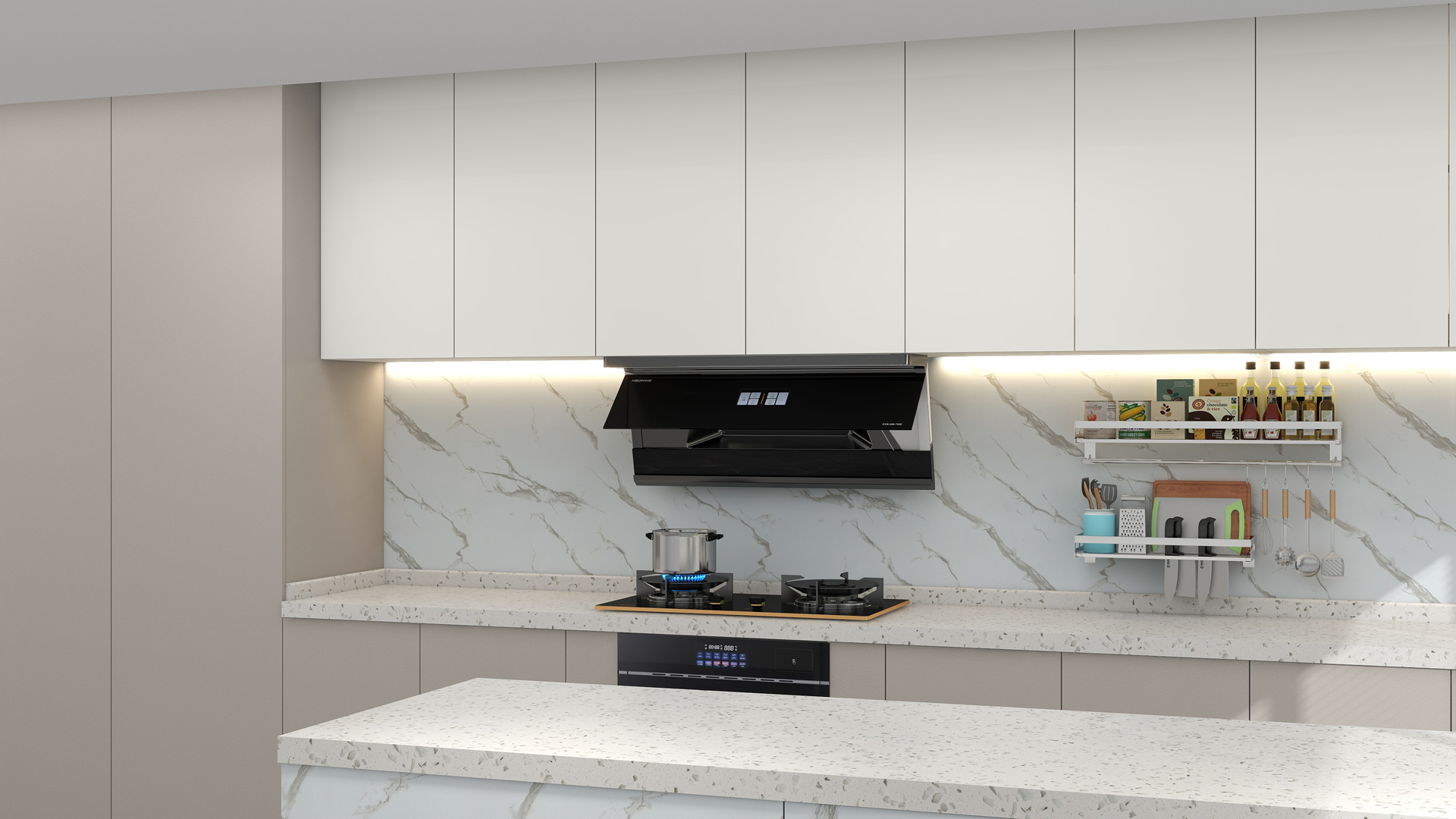 在設(shè)配性上,煙機7520突破傳統(tǒng)煙機安裝局限,采用365mm 小圍板結(jié)構(gòu),能夠完美適配多種尺寸的櫥柜。兼顧美學(xué)與實用性,全黑玻璃面板采用一體化成型工藝,不僅視覺上時尚大氣,適配現(xiàn)代簡約、輕奢等多種廚房裝修風(fēng)格,且表面光滑易清潔,有效降低日常維護難度。操作層面,模塊化觸摸鍵布局清晰,功能標(biāo)識直觀,搭配揮手智控技術(shù),無需觸碰面板即可完成風(fēng)量調(diào)節(jié)等操作,既便捷又衛(wèi)生,滿足了不同年齡段用戶的使用需求。