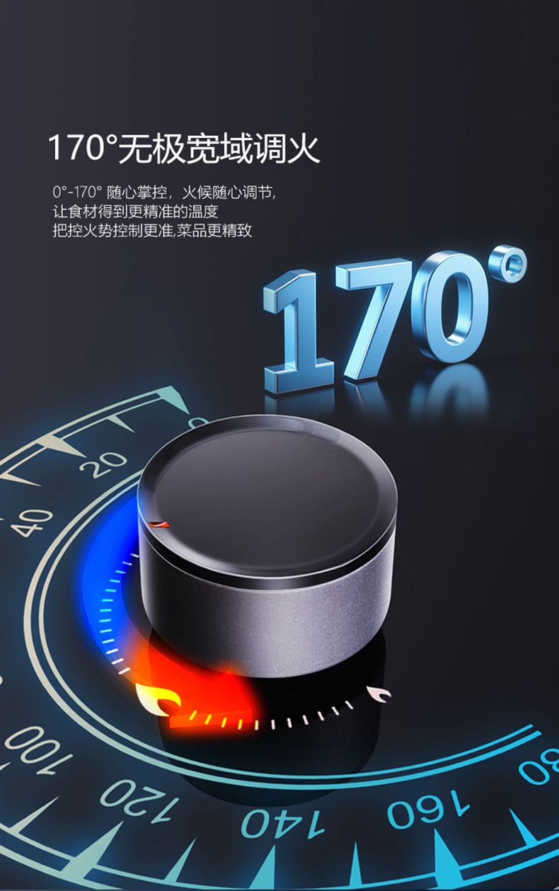 • 無(wú)極寬域調(diào)火,0°-170° 隨心掌控,火候自如